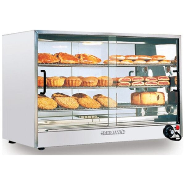 S/S electric food warmer with 3 shelves & internal light & removable tempered glass doors, Can be used for food or plate warming. i.e. Savouries, pizzas, fried chicken, pies, curry puffs.